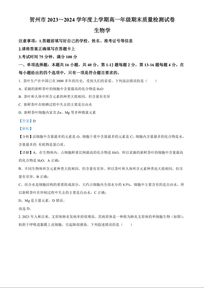 广西壮族自治区贺州市2023-2024学年高一上学期期末考试生物(解析版)
