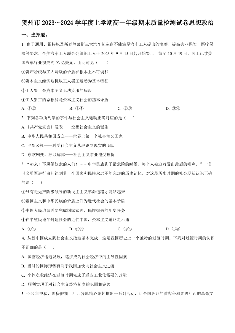 广西壮族自治区贺州市2023-2024学年高一上学期期末考试政治(原卷版)