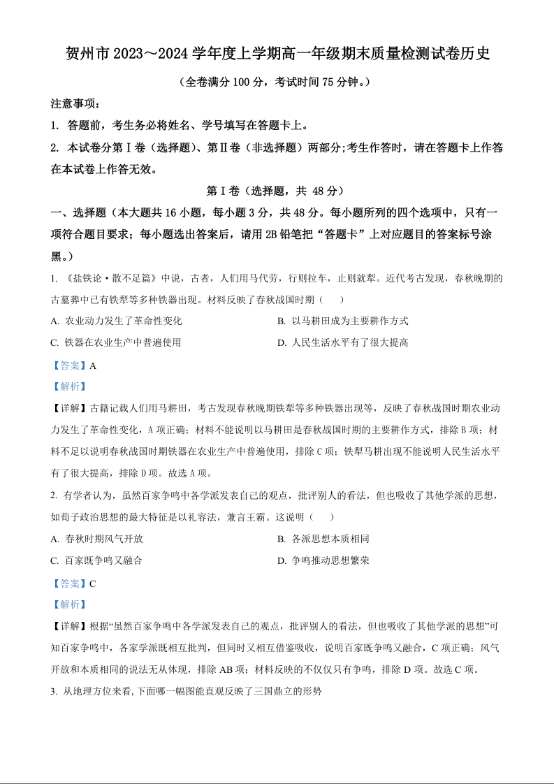 广西壮族自治区贺州市2023-2024学年高一上学期期末考试历史(解析版)