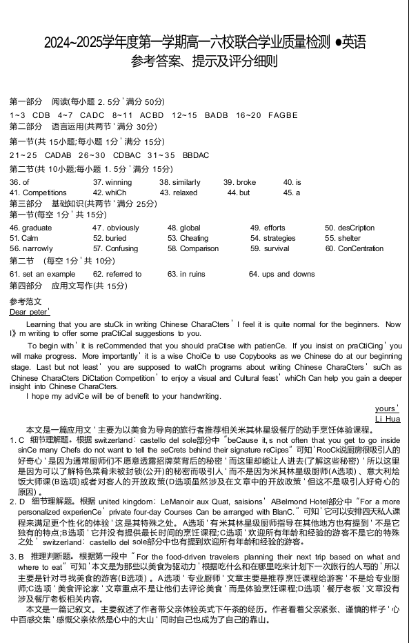 广东省六校2024-2025学年高一上学期12月联合考试英语答案