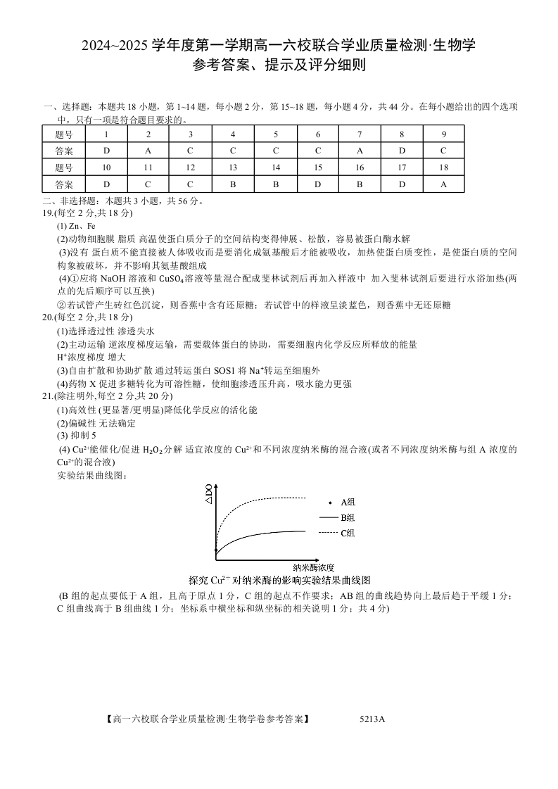 广东省六校2024-2025学年高一上学期12月联合考试生物答案
