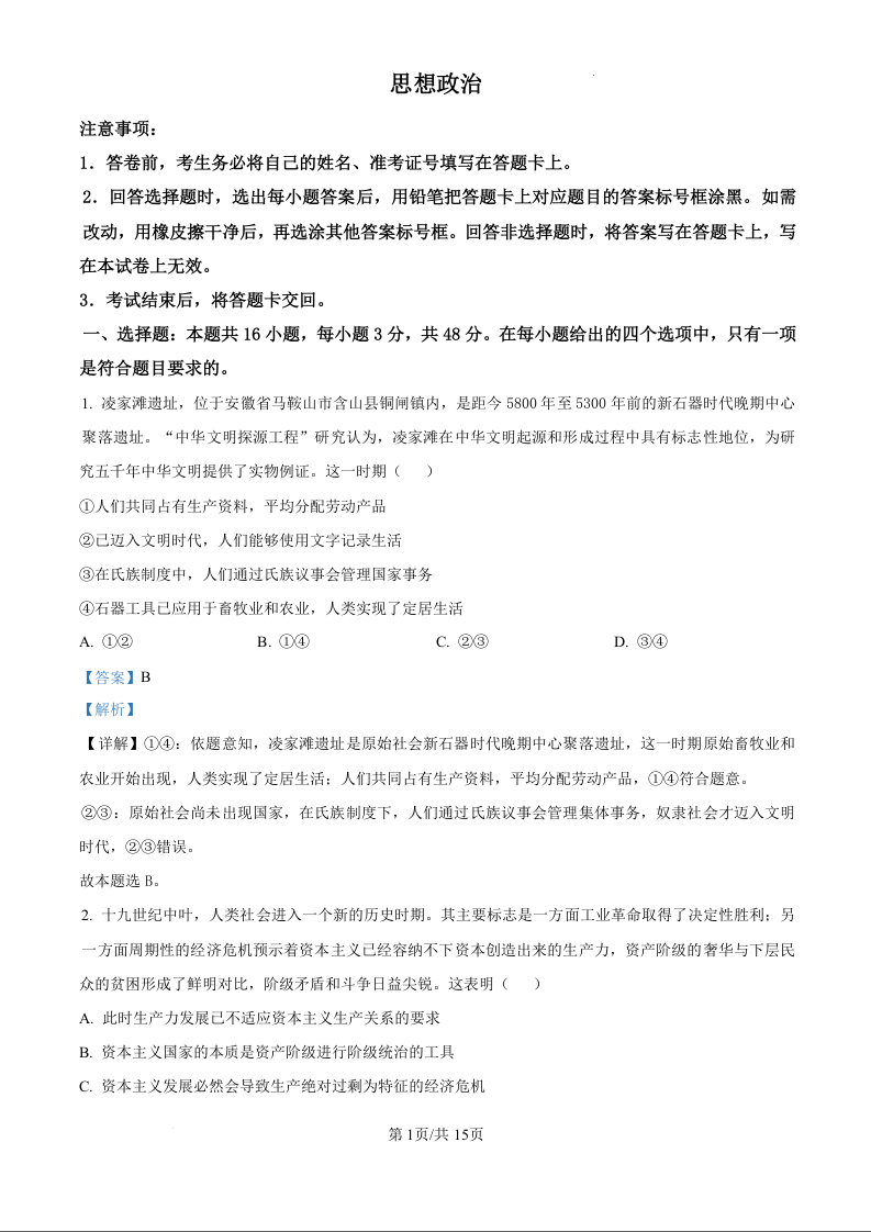 安徽省师大附中2024-2025学年高一上学期12月月考生物政治(精品解析版)