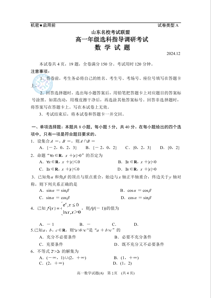 山东省济南市名校考试联盟2024.12高一年级选科指导调研考试数学(A)