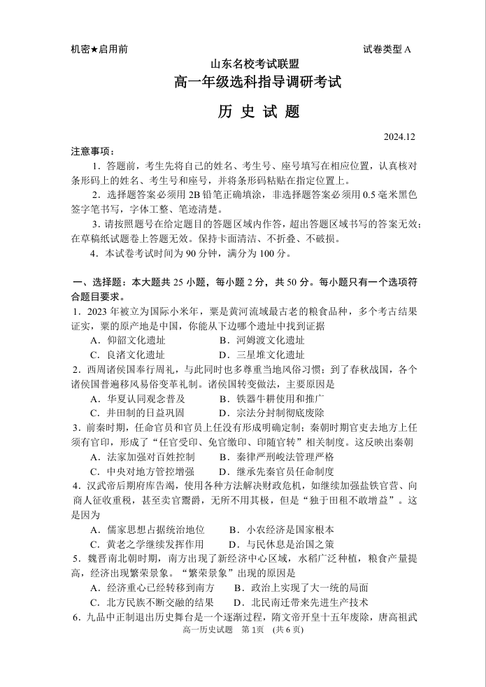 山东省济南市名校考试联盟2024.12高一年级选科指导调研考试历史