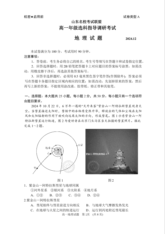 山东省济南市名校考试联盟2024.12高一年级选科指导调研考试地理