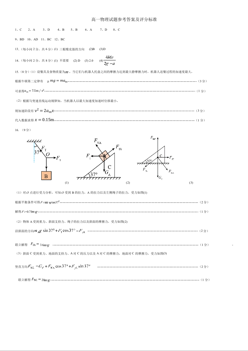 山东省济南市名校考试联盟2024.12高一年级选科指导调研考试物理评分标准