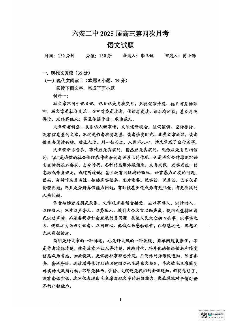 安徽省六安市第二中学2025届高三上学期12月第四次月考语文+答案