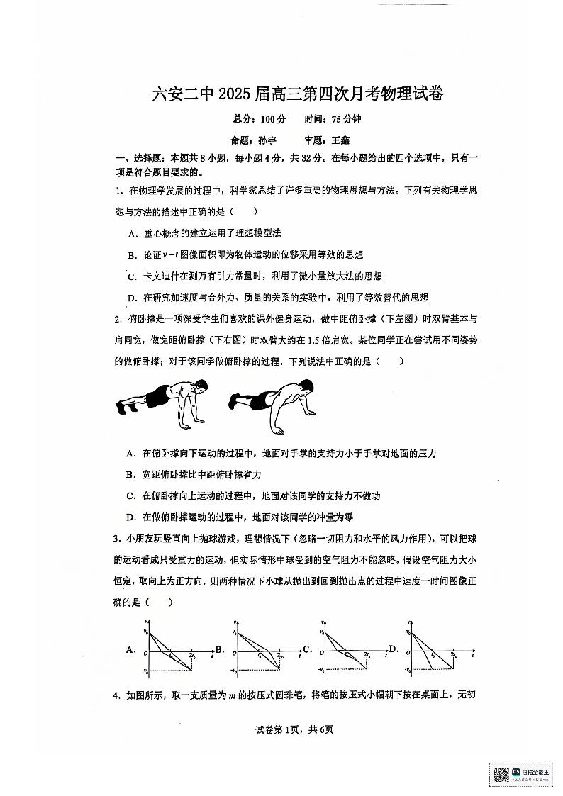 安徽省六安市第二中学2025届高三上学期12月第四次月考物理+答案
