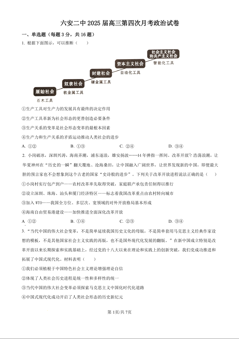 安徽省六安市第二中学2025届高三上学期12月第四次月考政治(原卷版)