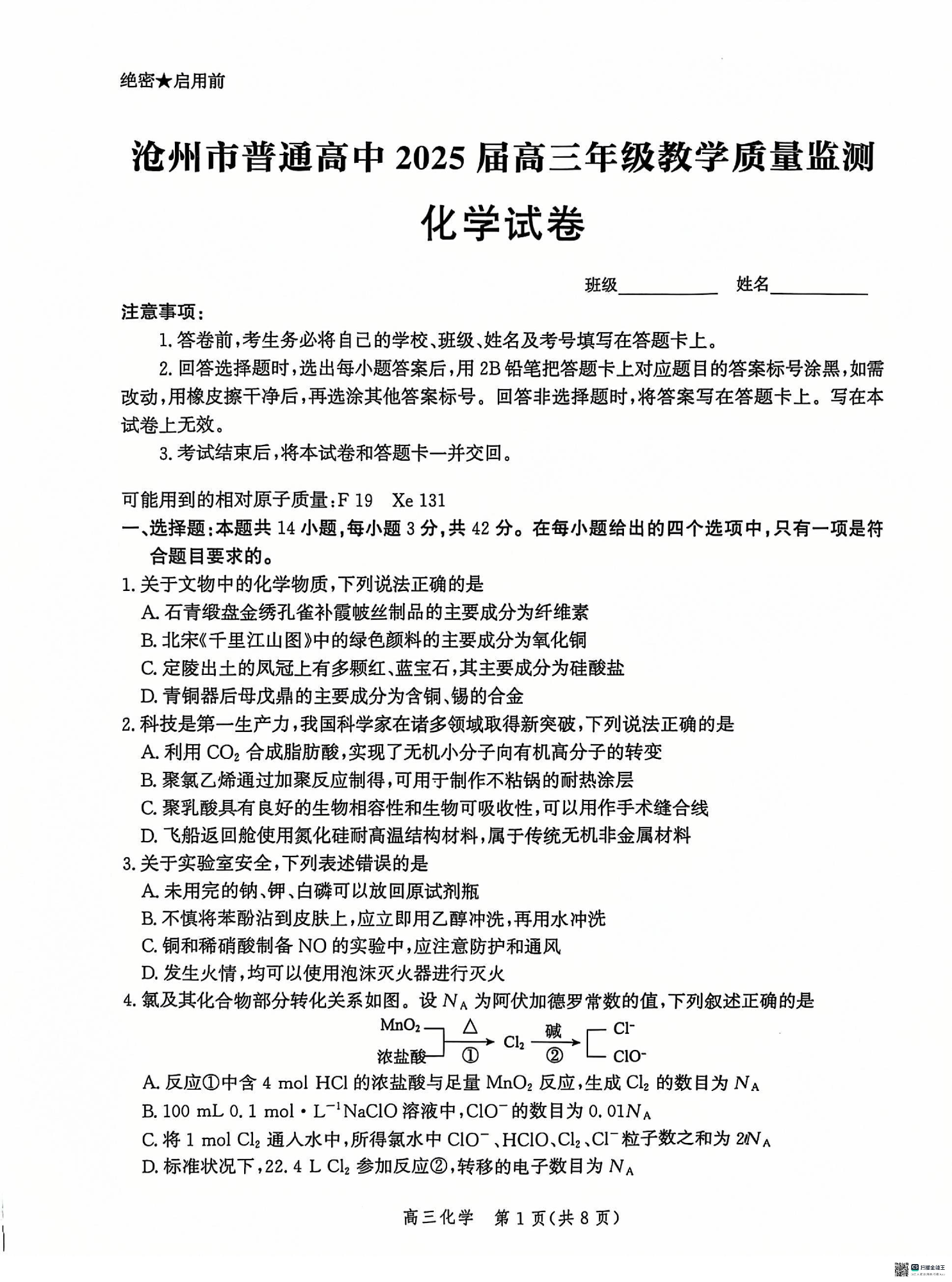 河北省沧州市普通高中2025届高三年级12月教学质量监测化学+答案