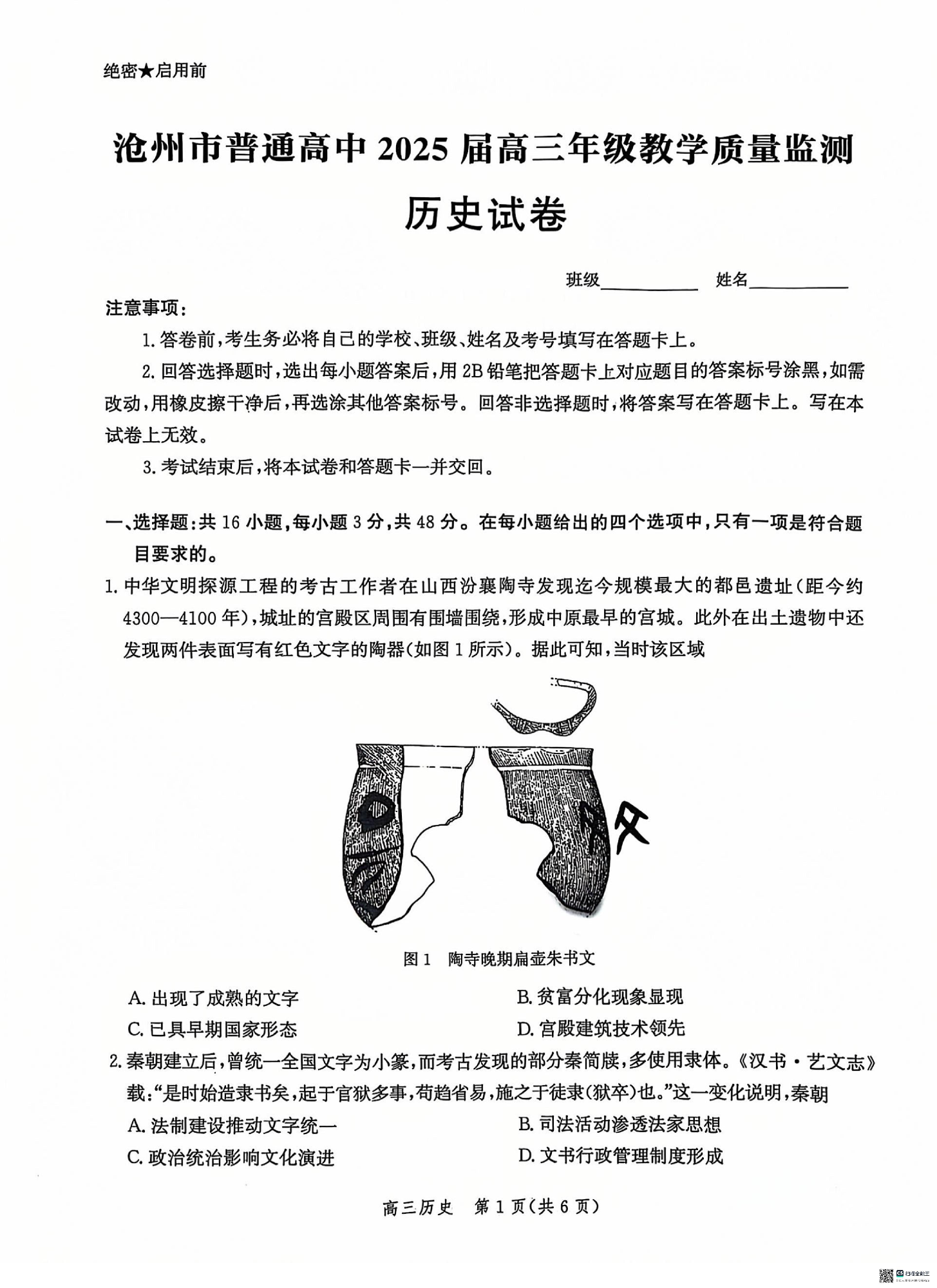 河北省沧州市普通高中2025届高三年级12月教学质量监测历史+答案
