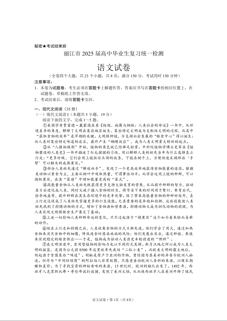 云南省丽江市高中2025届高三毕业生12月复习统一检测语文