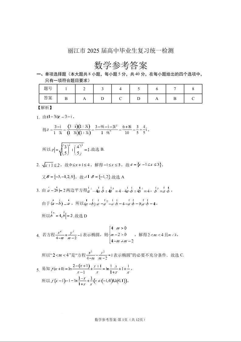 云南省丽江市高中2025届高三毕业生12月复习统一检测数学答案