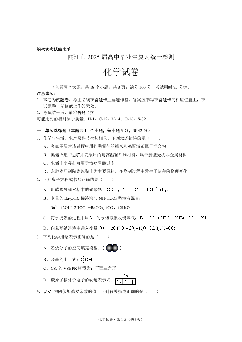 云南省丽江市高中2025届高三毕业生12月复习统一检测化学