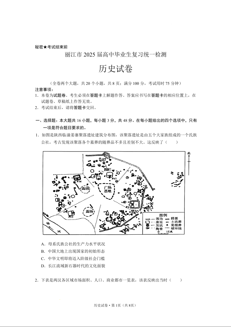 云南省丽江市高中2025届高三毕业生12月复习统一检测历史