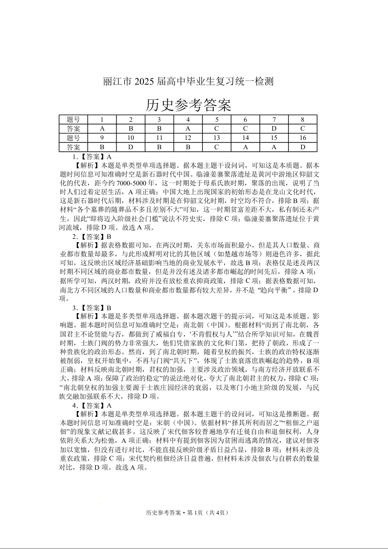 云南省丽江市高中2025届高三毕业生12月复习统一检测历史答案
