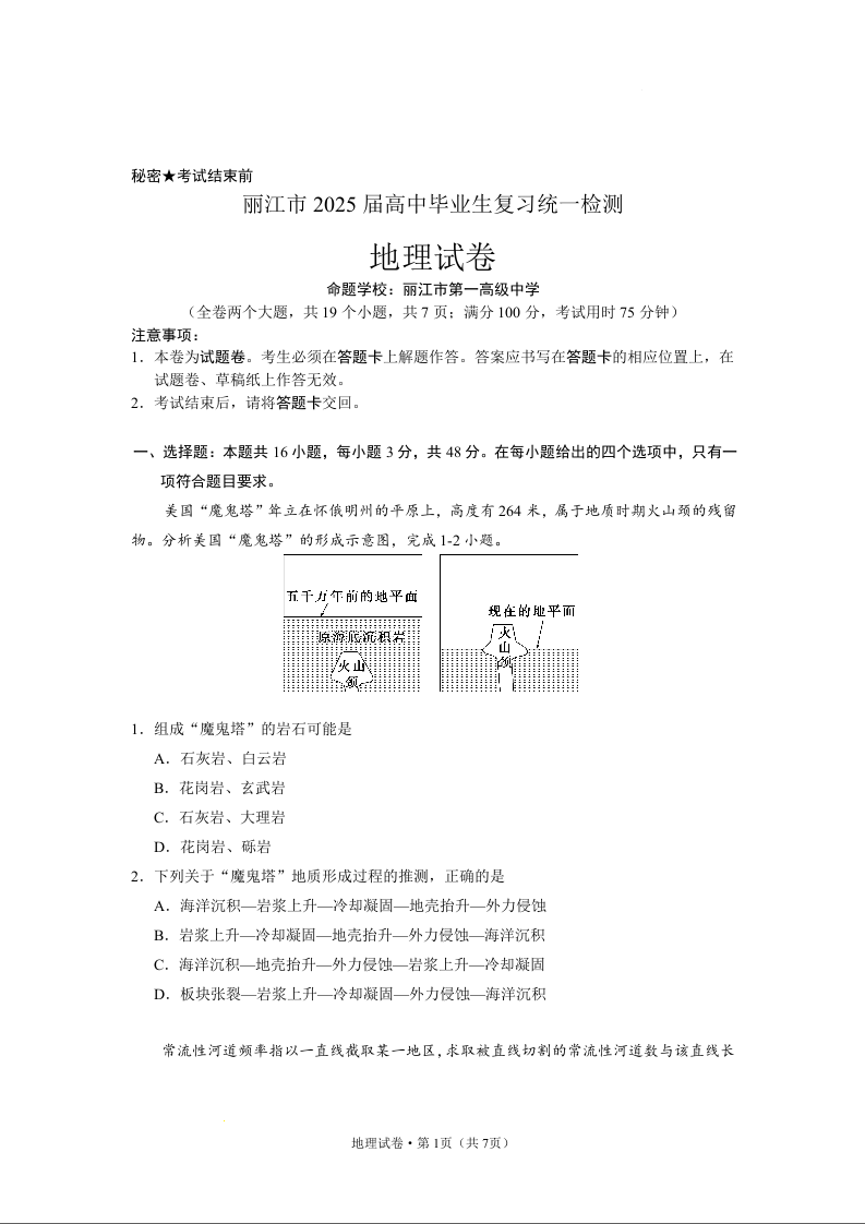 云南省丽江市高中2025届高三毕业生12月复习统一检测地理