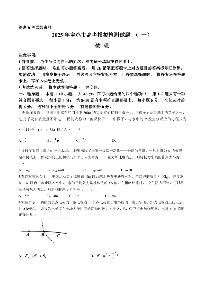 陕西省宝鸡市2025届高三上学期高考模拟检测(一)物理+答案
