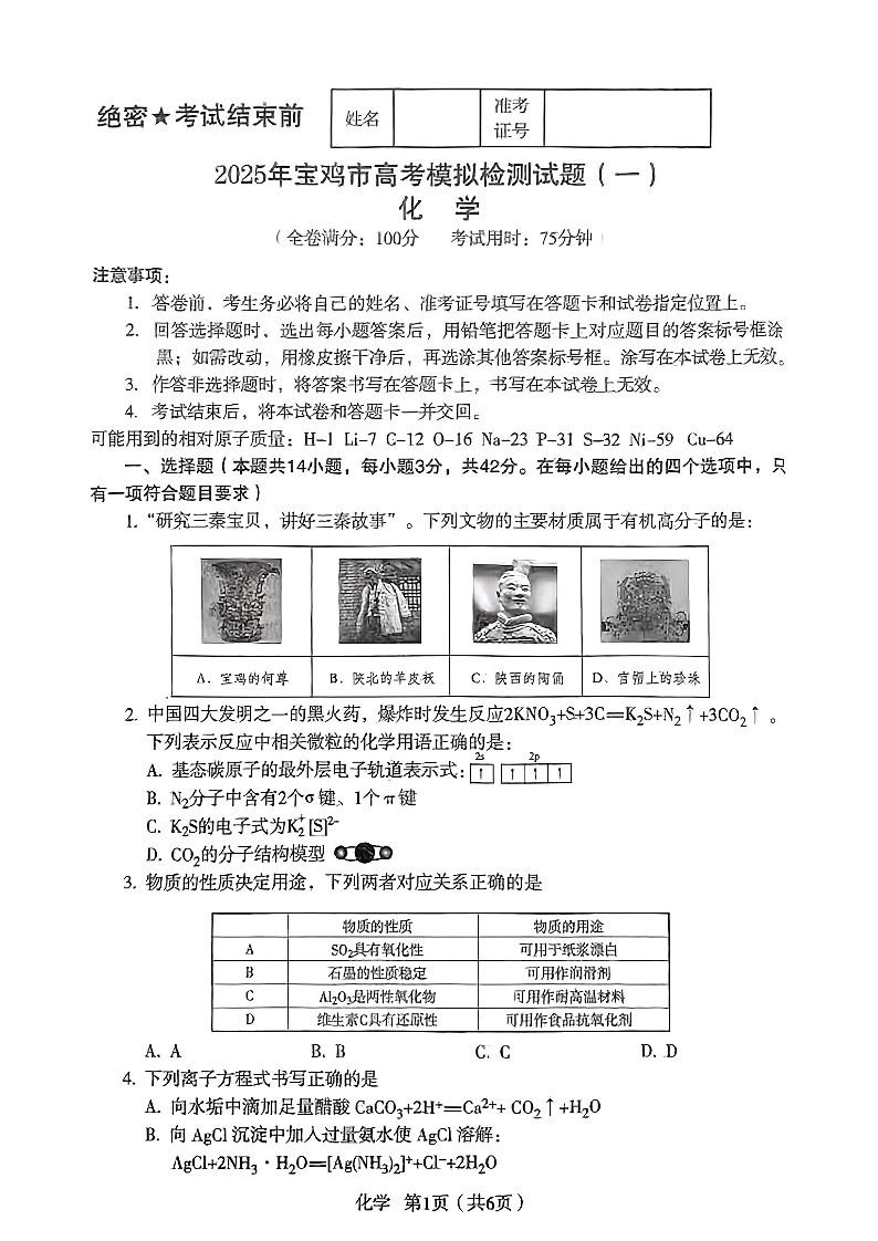 陕西省宝鸡市2025届高三上学期高考模拟检测(一)化学