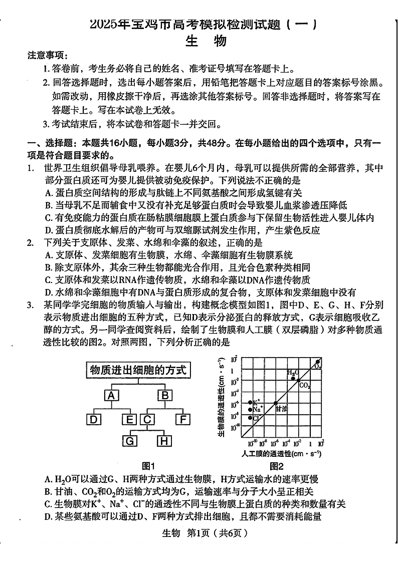 陕西省宝鸡市2025届高三上学期高考模拟检测(一)生物