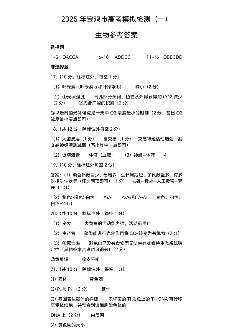 陕西省宝鸡市2025届高三上学期高考模拟检测(一)生物答案