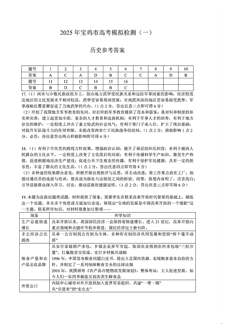 陕西省宝鸡市2025届高三上学期高考模拟检测(一)历史答案