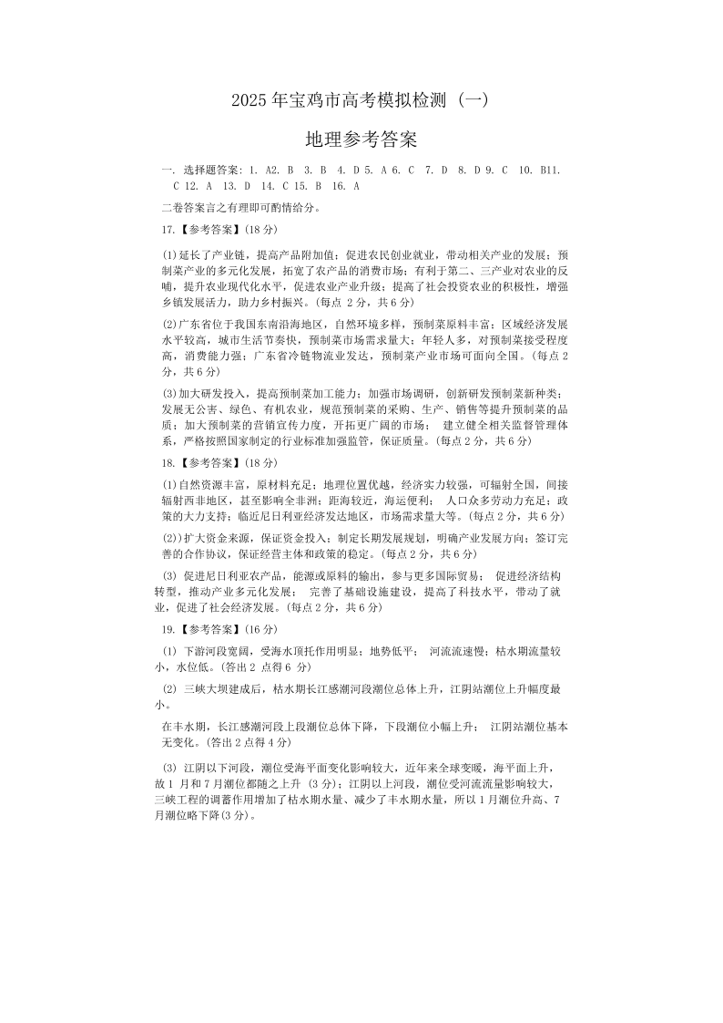 陕西省宝鸡市2025届高三上学期高考模拟检测(一)地理答案