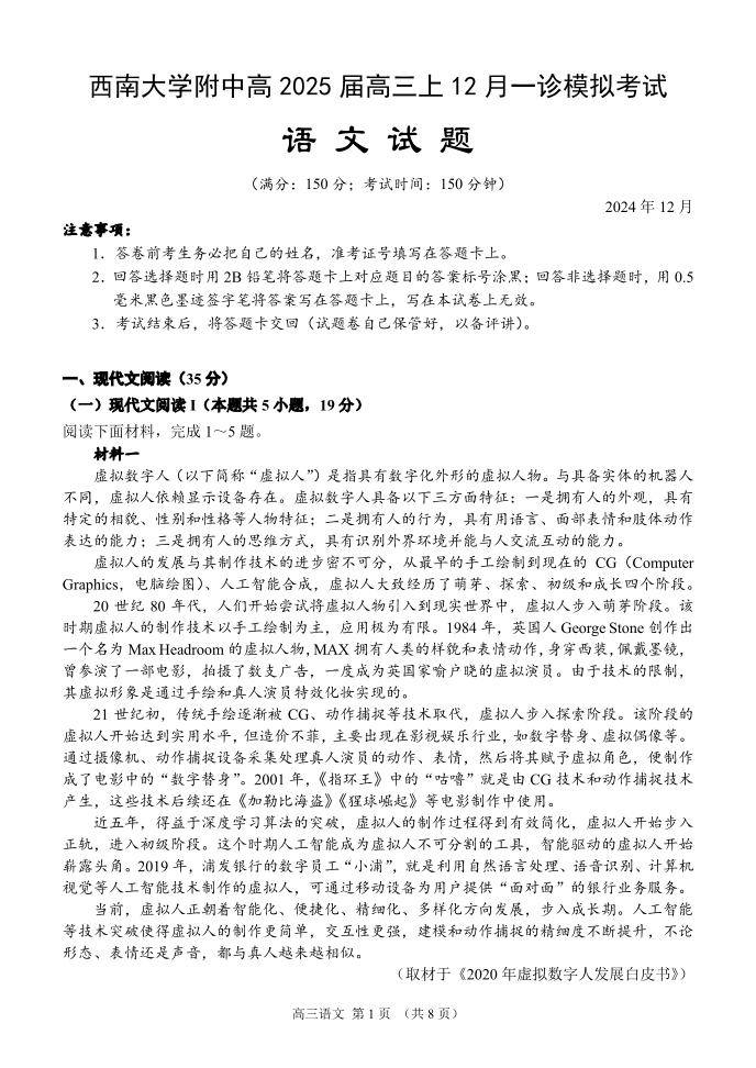 重庆市西南大学附属中学2025届高三一诊模拟考试语文