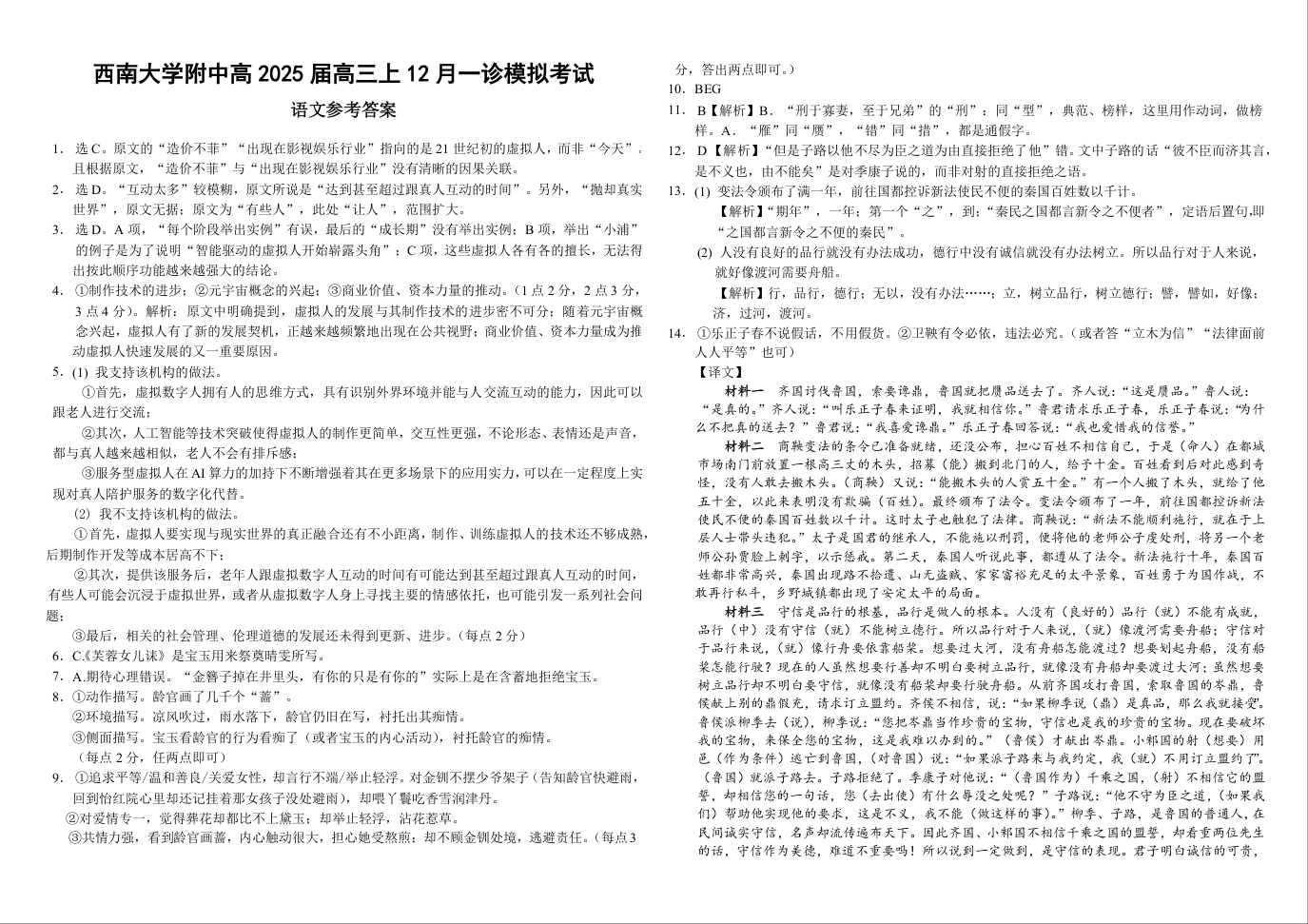 重庆市西南大学附属中学2025届高三一诊模拟考试语文答案