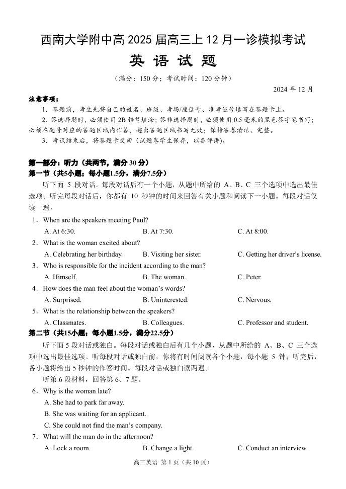 重庆市西南大学附属中学2025届高三一诊模拟考试英语