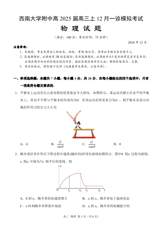 重庆市西南大学附属中学2025届高三一诊模拟考试物理