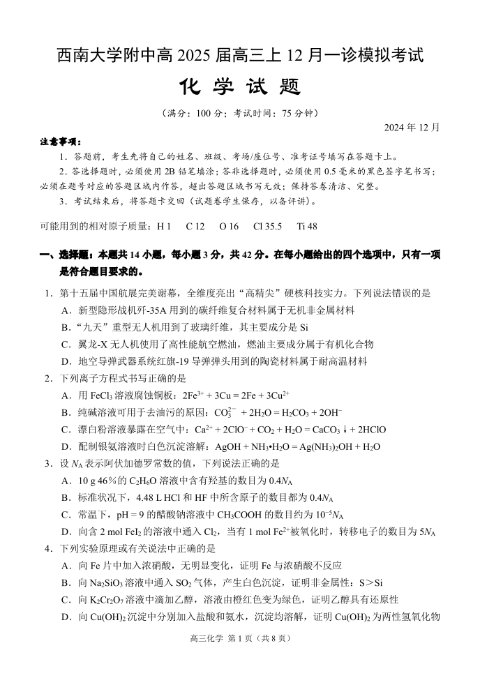 重庆市西南大学附属中学2025届高三一诊模拟考试化学