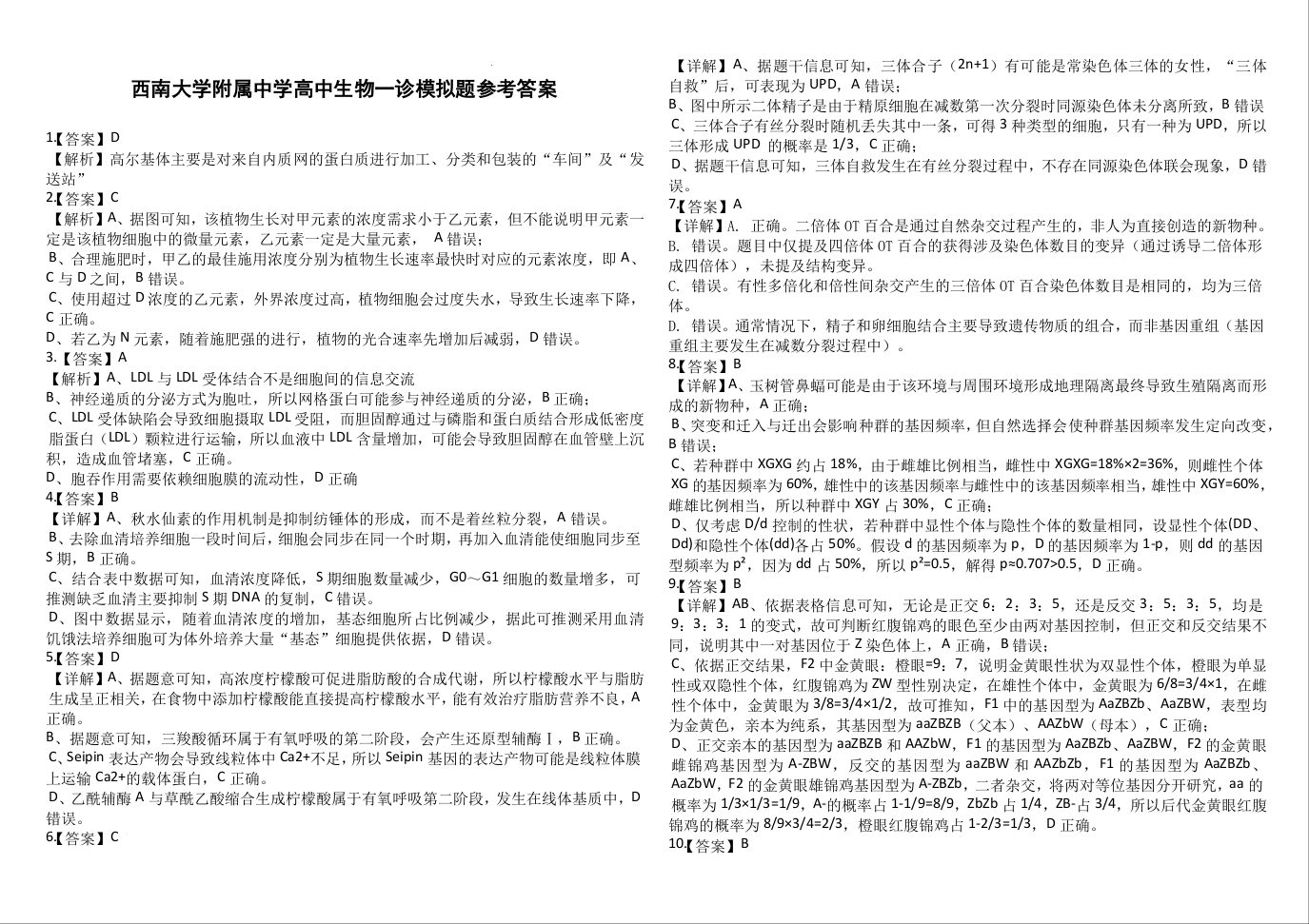 重庆市西南大学附属中学2025届高三一诊模拟考试生物答案