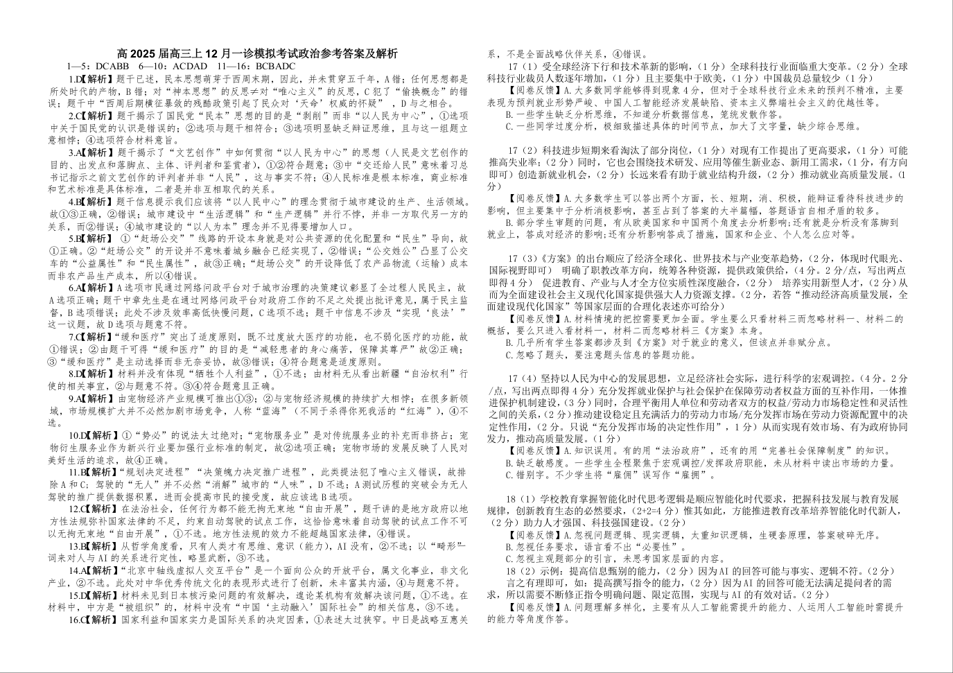 重庆市西南大学附属中学2025届高三一诊模拟考试政治答案