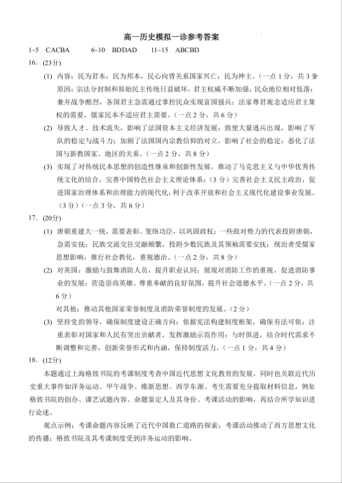 重庆市西南大学附属中学2025届高三一诊模拟考试历史答案