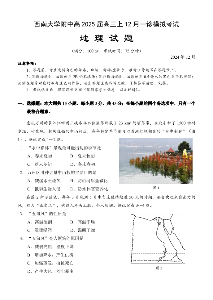 重庆市西南大学附属中学2025届高三一诊模拟考试地理