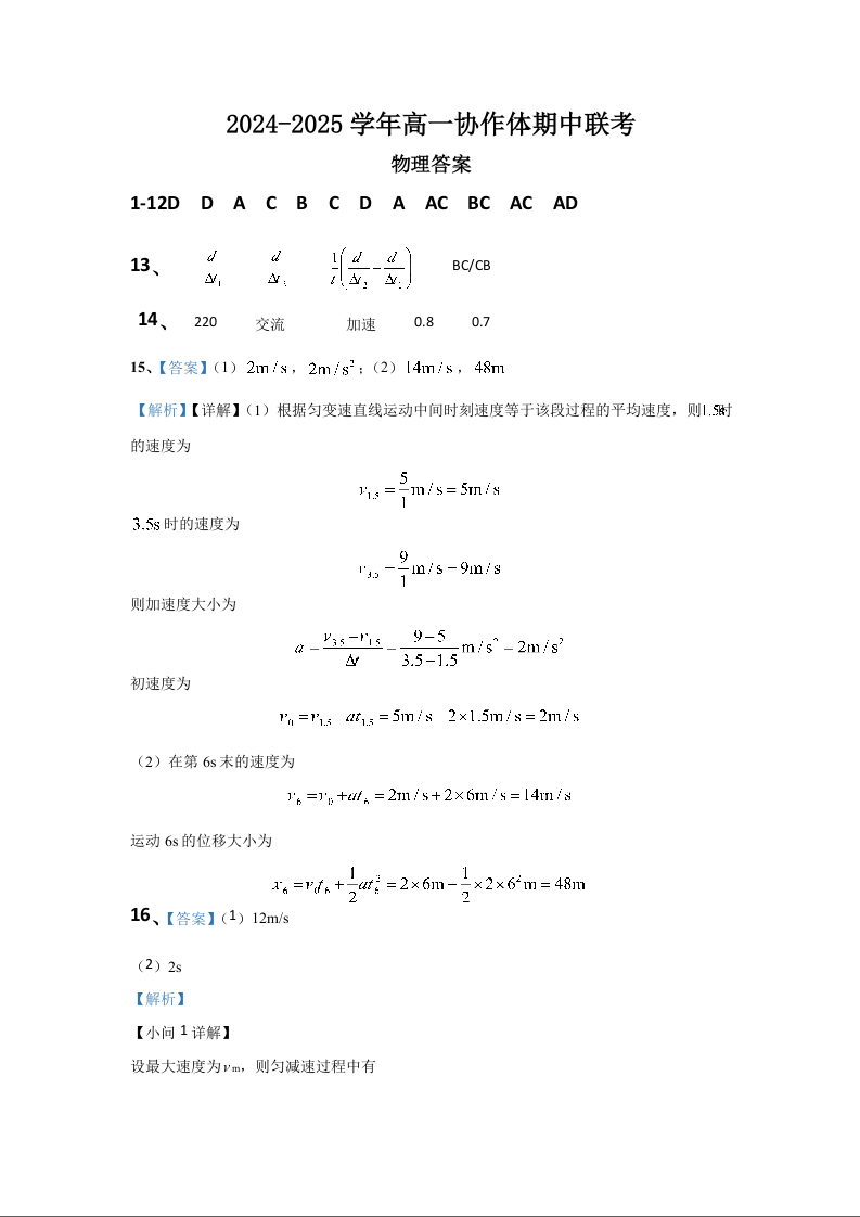 四川省眉山市仁寿县协作体2024-2025学年高一上学期11月期中联考物理答案