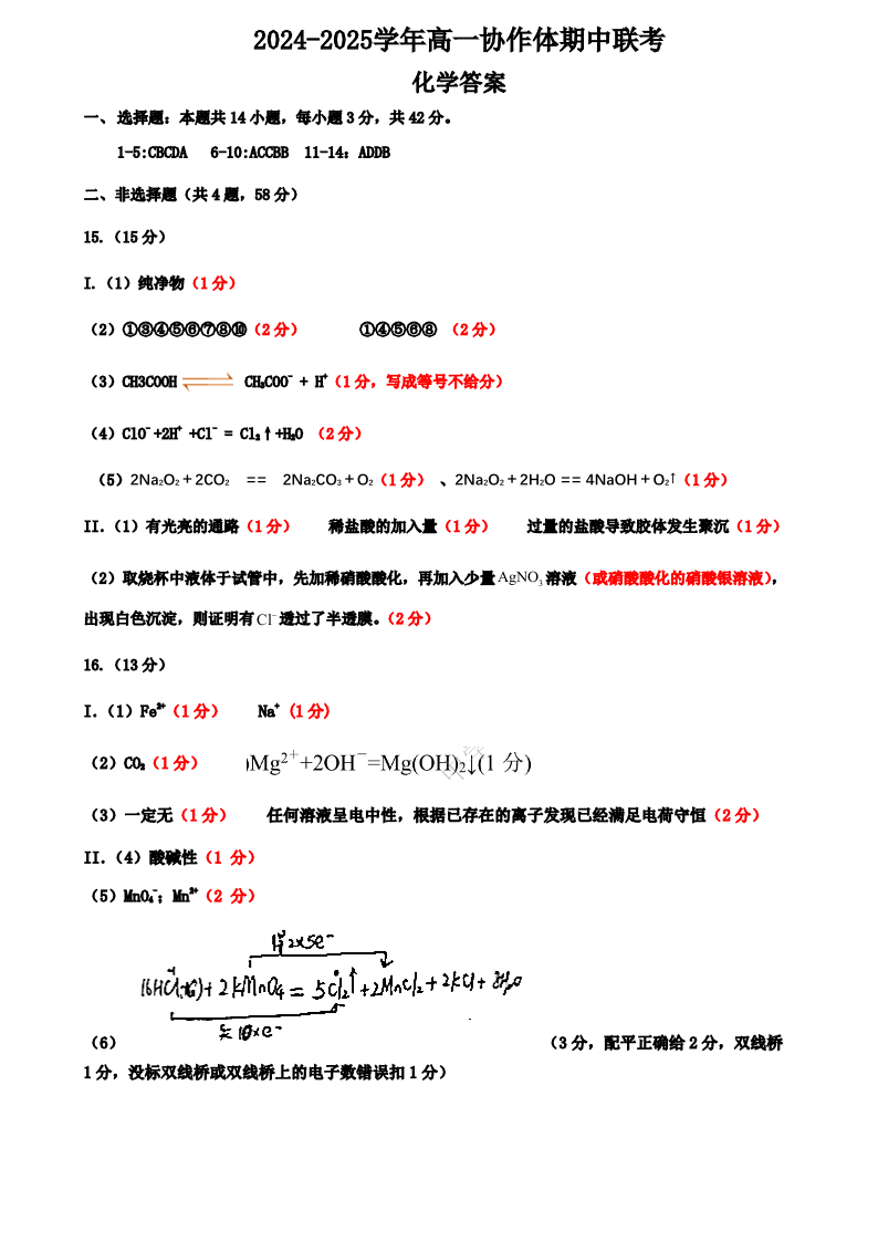 四川省眉山市仁寿县协作体2024-2025学年高一上学期11月期中联考化学答案
