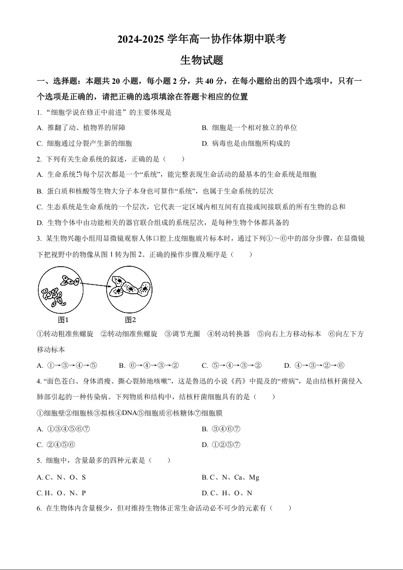 四川省眉山市仁寿县协作体2024-2025学年高一上学期11月期中联考生物(原卷版)