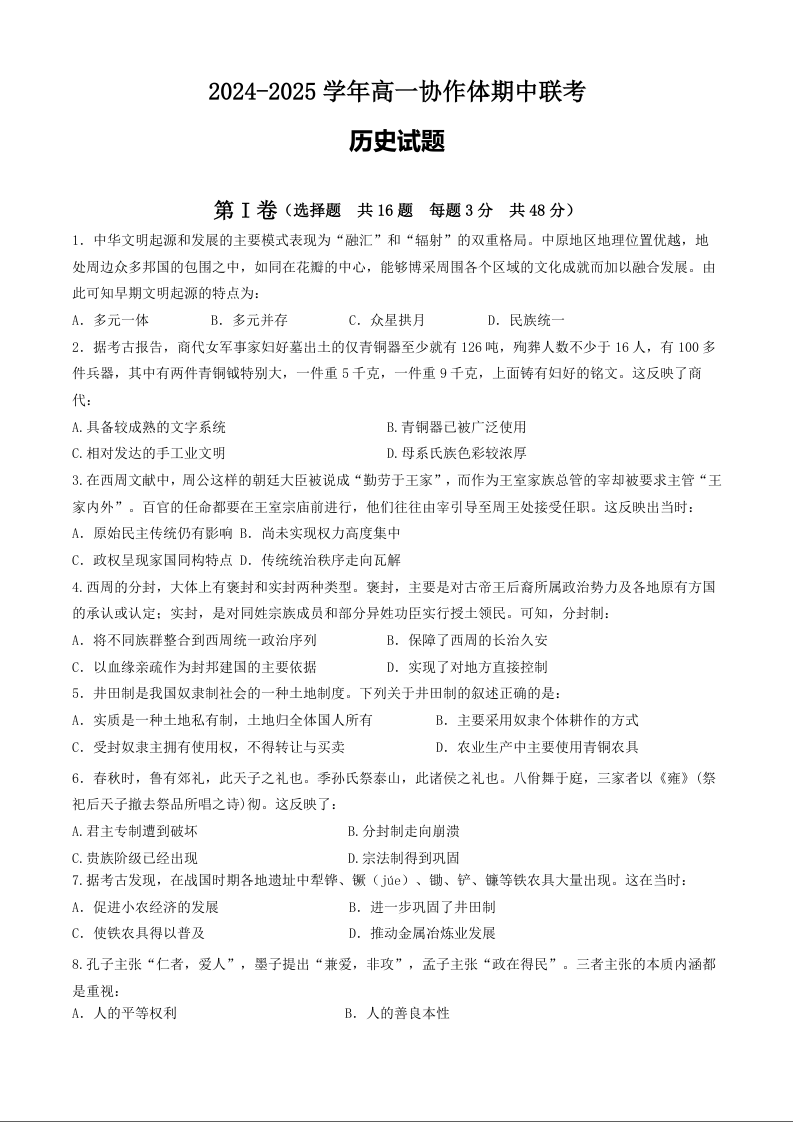 四川省眉山市仁寿县协作体2024-2025学年高一上学期11月期中联考历史