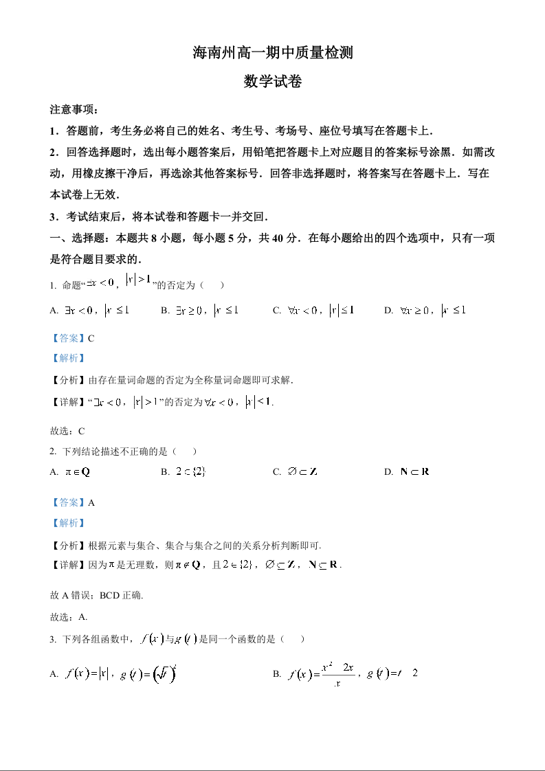 青海省海南州2024-2025学年高一上学期期中质量检测试题数学(解析版)