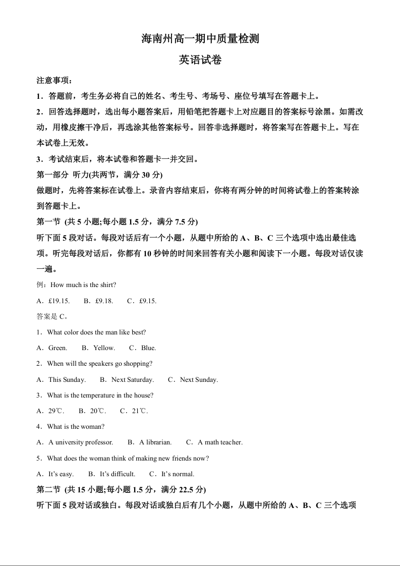 青海省海南州2024-2025学年高一上学期期中质量检测试题英语(解析版)