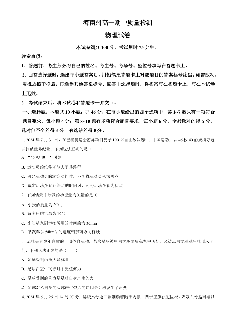 青海省海南州2024-2025学年高一上学期期中质量检测试题物理(原卷版)