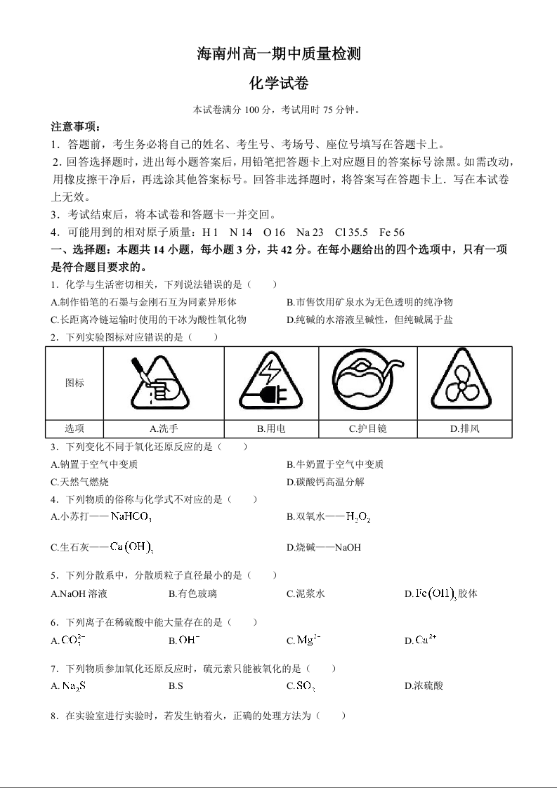 青海省海南州2024-2025学年高一上学期期中质量检测试题化学+答案