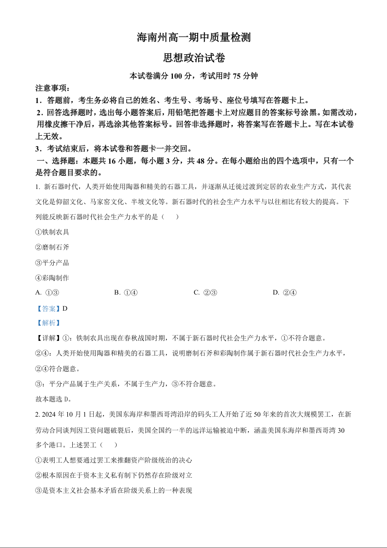 青海省海南州2024-2025学年高一上学期期中质量检测试题政治(解析版)