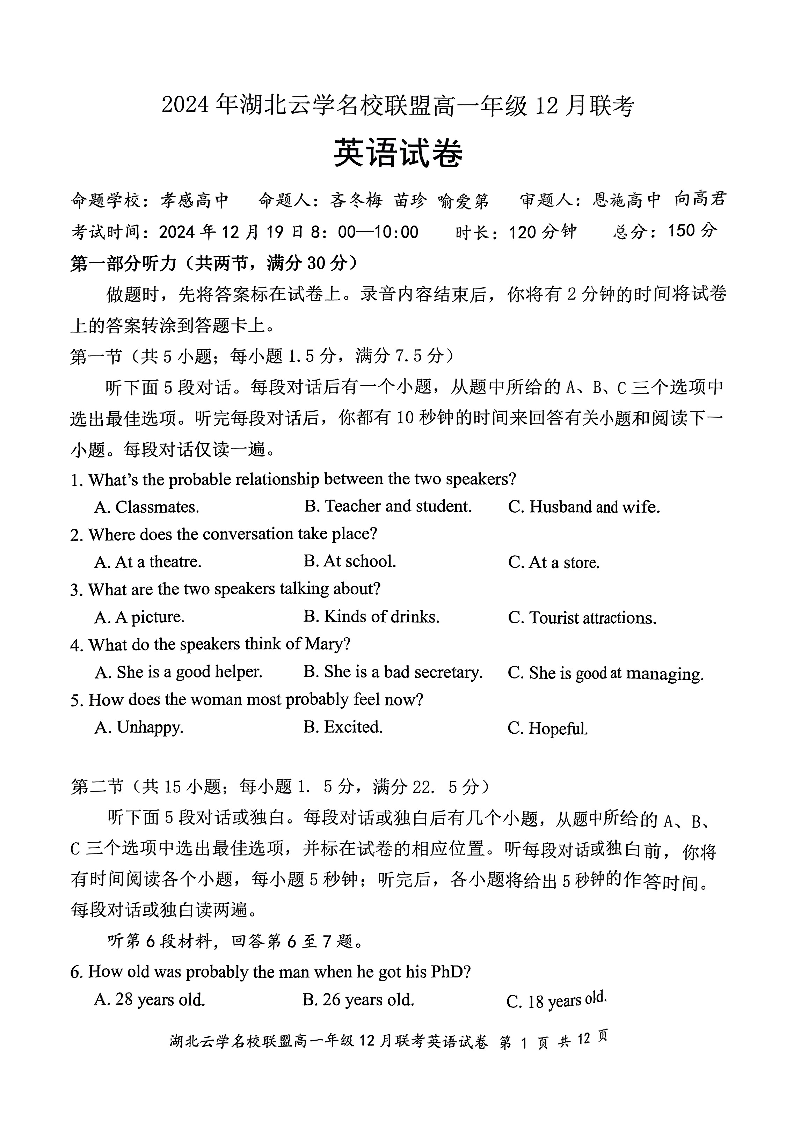 湖北省云学名校联盟2024-2025学年高一上学期12月联考英语