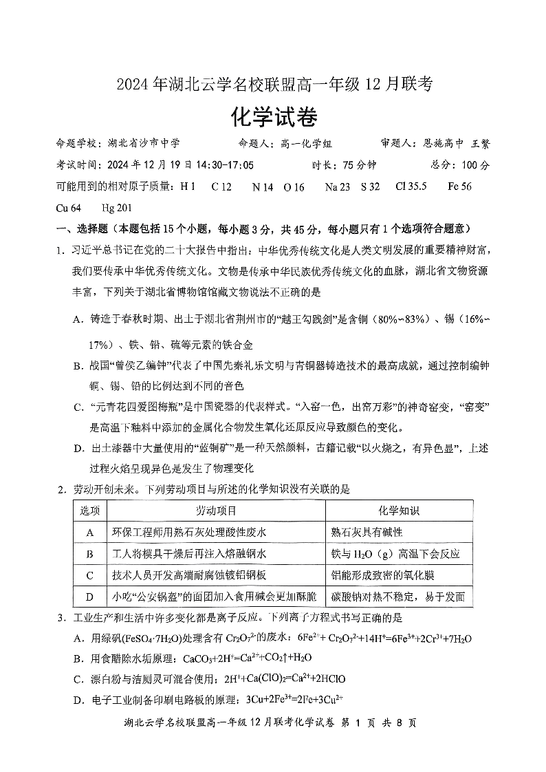 湖北省云学名校联盟2024-2025学年高一上学期12月联考化学