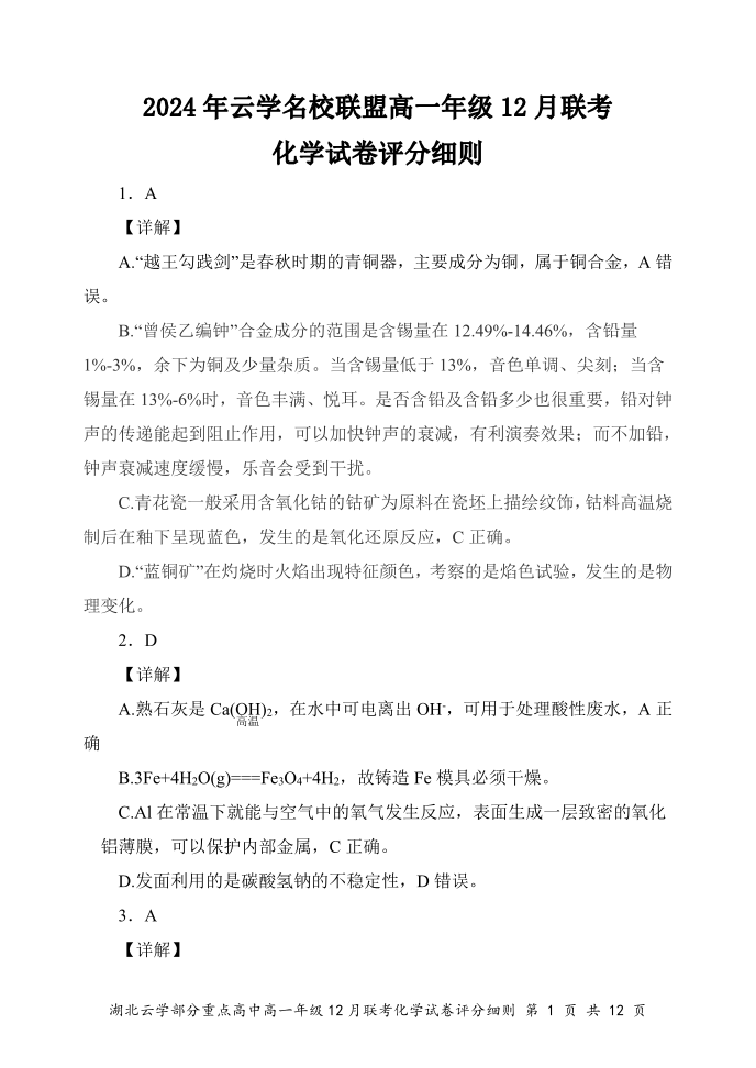 湖北省云学名校联盟2024-2025学年高一上学期12月联考化学答案