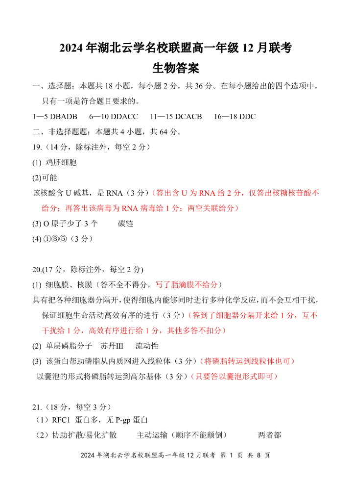 湖北省云学名校联盟2024-2025学年高一上学期12月联考生物学答案