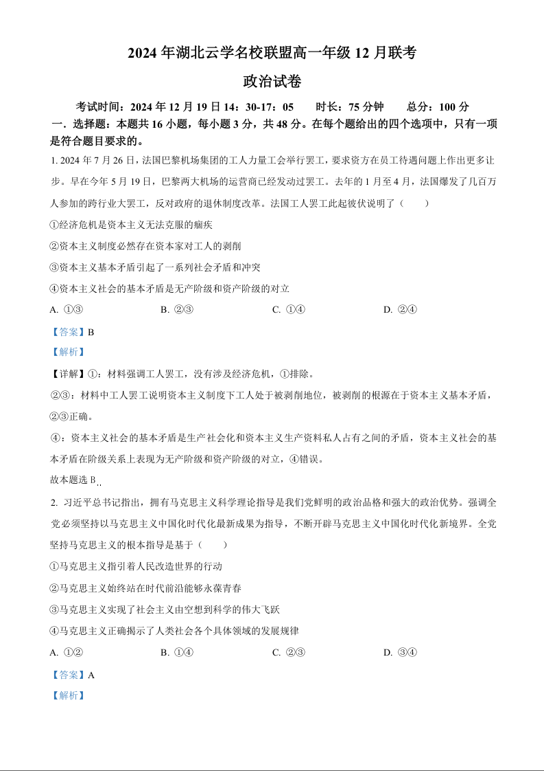 湖北省云学名校联盟2024-2025学年高一上学期12月联考政治(解析版)